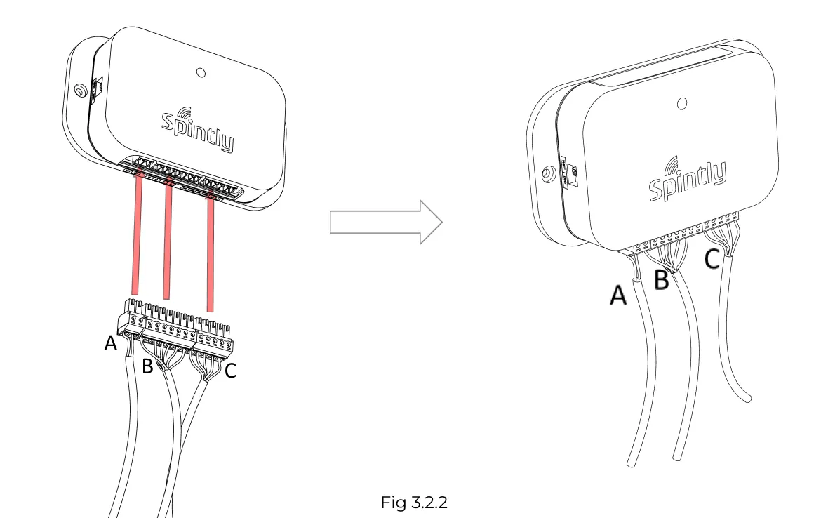 To ensure proper setup, follow the connection diagram (Fig 3.1.1 below) and screw in the wires into A, B, C (using screw driver provided in box)